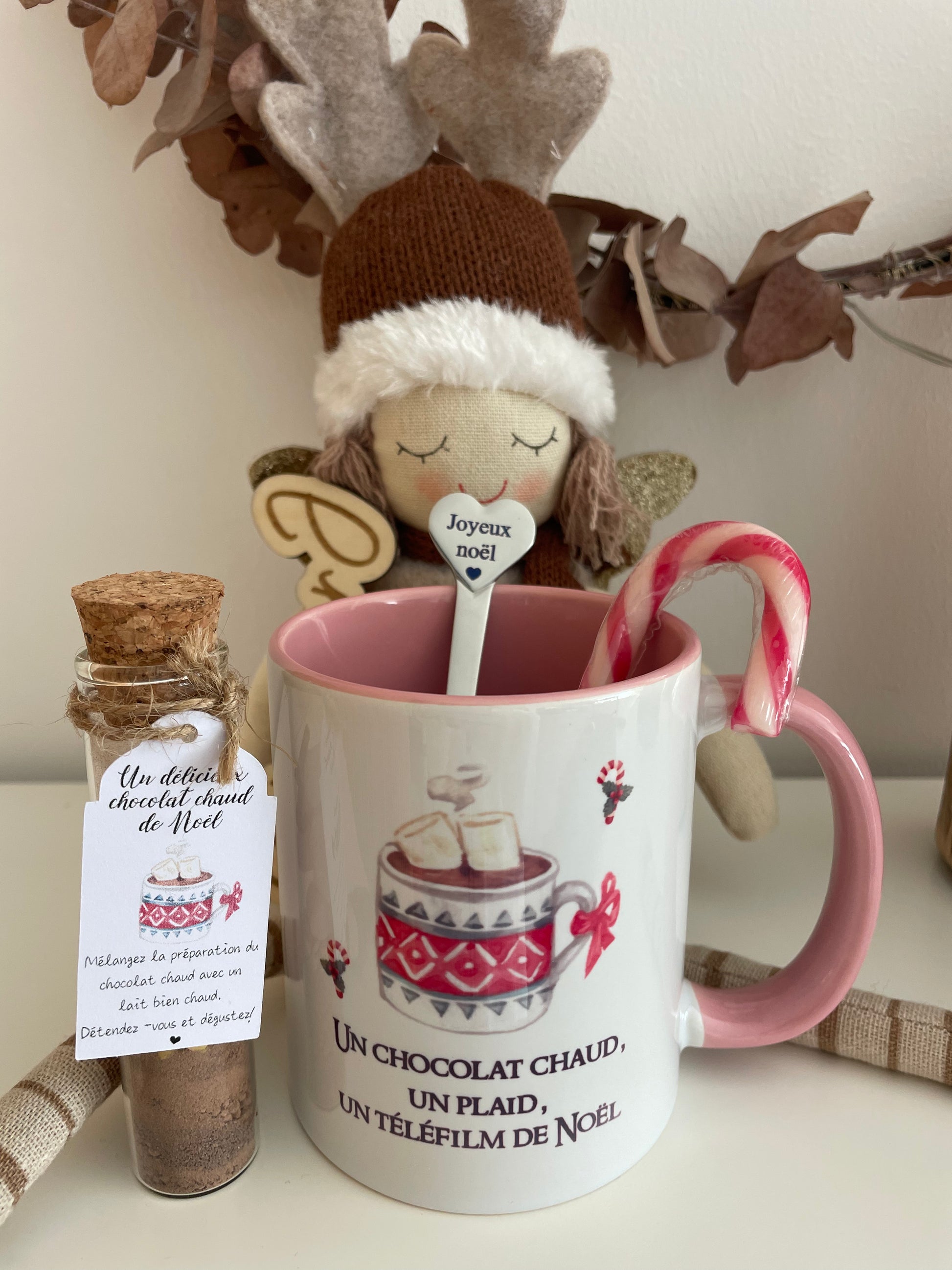 Ce kit comprends une tasse , une cuillère « Joyeux noël « une fiole avec le nécessaire chocolat chaud et un sucre d’orge.